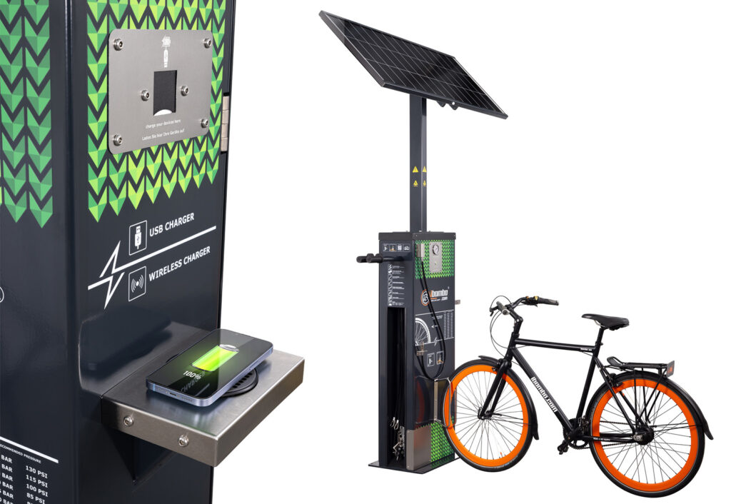 IBOMBO PRS-SUNO è una stazione di riparazione biciclette self-service alimentata a energia solare che garantisce la completa indipendenza energetica (off-grid) grazie al pannello da 190 W e alla batteria da 45 Ah. Consente di ricaricare i dispositivi tramite USB e ricarica induttiva, mentre l'illuminazione a LED con sensore di movimento e crepuscolare garantisce un utilizzo confortevole in qualsiasi momento.