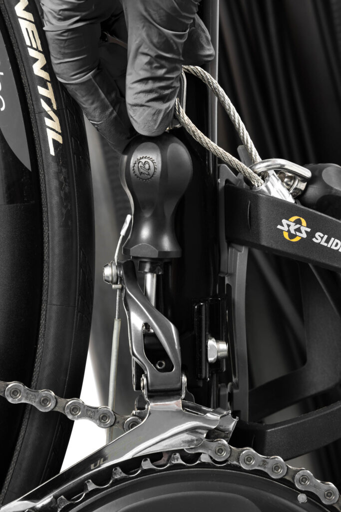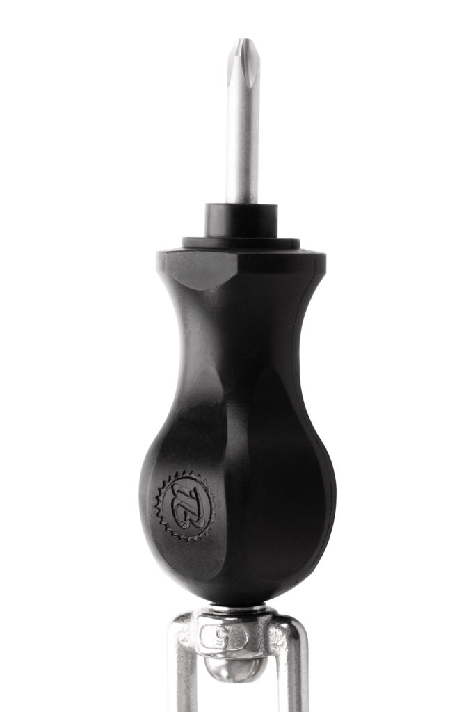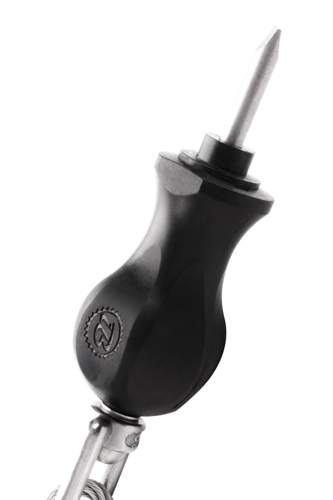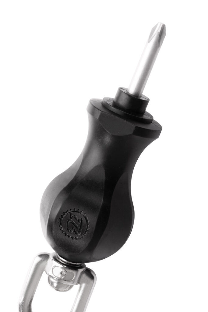 Il cuore della soluzione è il perno integrato con una guaina di sicurezza (la cosiddetta ghiera di rottura), che collega permanentemente lo snodo allo strumento. Questo garantisce che la connessione sia resistente a danni, tentativi di svitamento o furto, pur permettendo una rotazione libera e un elevato comfort per l’utente. È una combinazione di ergonomia e durabilità – qualità che definiscono lo standard di qualità IBOMBO.