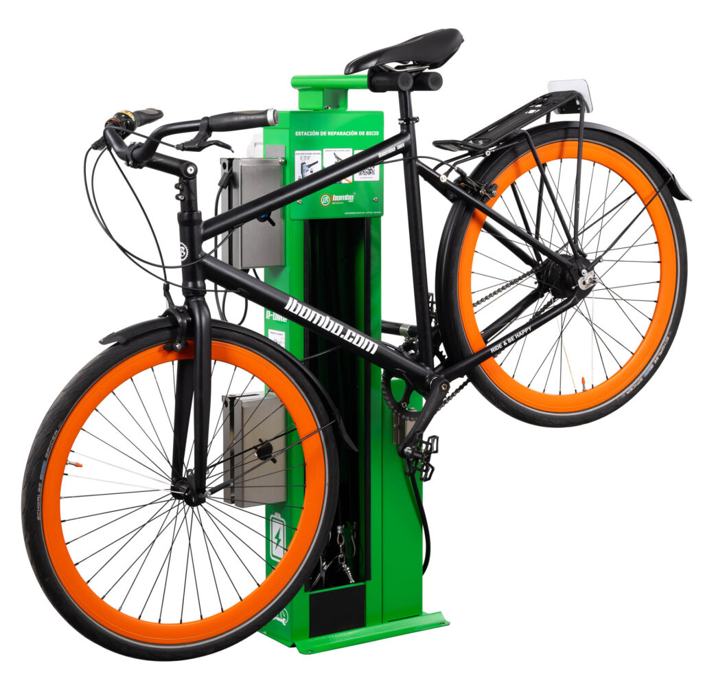 Gli attrezzi vengono fissati alle funi in acciaio inox appese all’interno della colonna della stazione; la lunghezza delle corde permette di raggiungere tutti i componenti della bicicletta. Il rivestimento in gomma delle corde impedisce agli attrezzi di aggrovigliarsi e protegge il telaio della bicicletta dai graffi. La stazione è dotata di una pompa manuale con un adattatore per tutti i tipi di valvole. La costruzione della stazione consente di posizionare la bicicletta sull’impugnatura, in modo da poter girare facilmente la pedivella durante la riparazione della bicicletta.