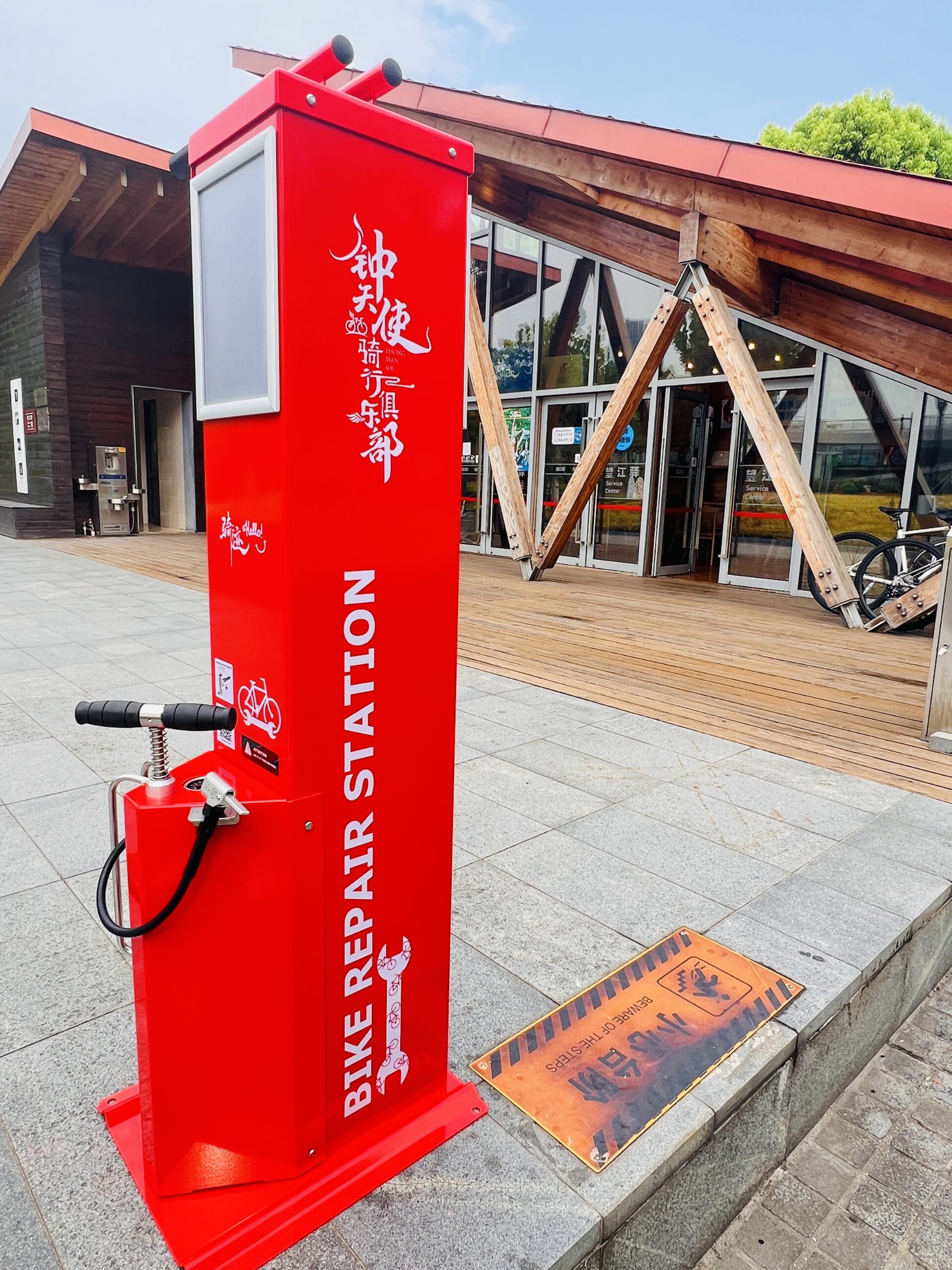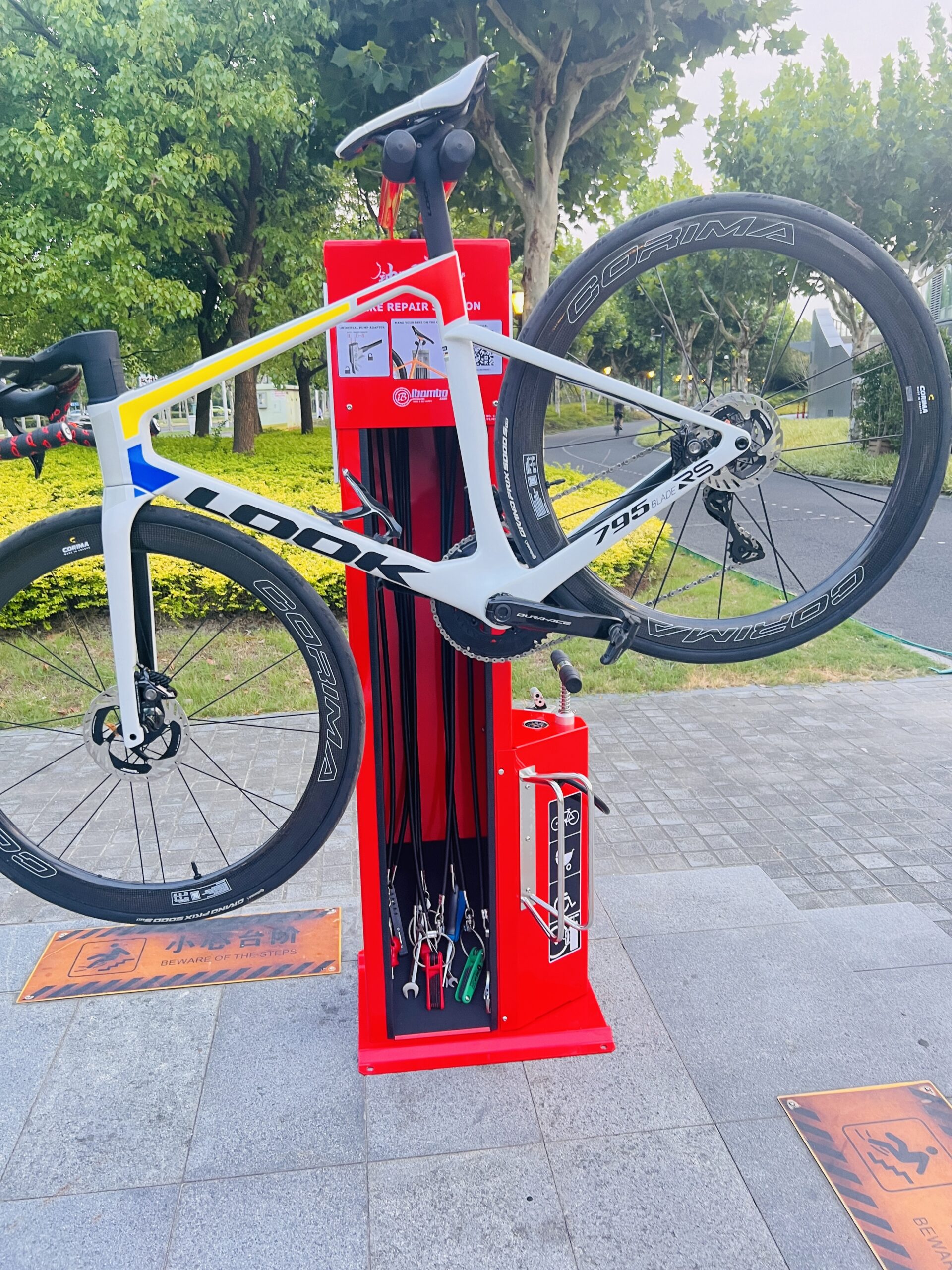 Gli attrezzi vengono fissati alle funi in acciaio inox appese all’interno della colonna della stazione; la lunghezza delle corde permette di raggiungere tutti i componenti della bicicletta. Il rivestimento in gomma delle corde impedisce agli attrezzi di aggrovigliarsi e protegge il telaio della bicicletta dai graffi. La costruzione della stazione consente di posizionare la bicicletta sull’impugnatura, in modo da poter girare facilmente la pedivella durante la riparazione della bicicletta. La stazione è dotata di una pompa manuale con un adattatore per tutti i tipi di valvole.
