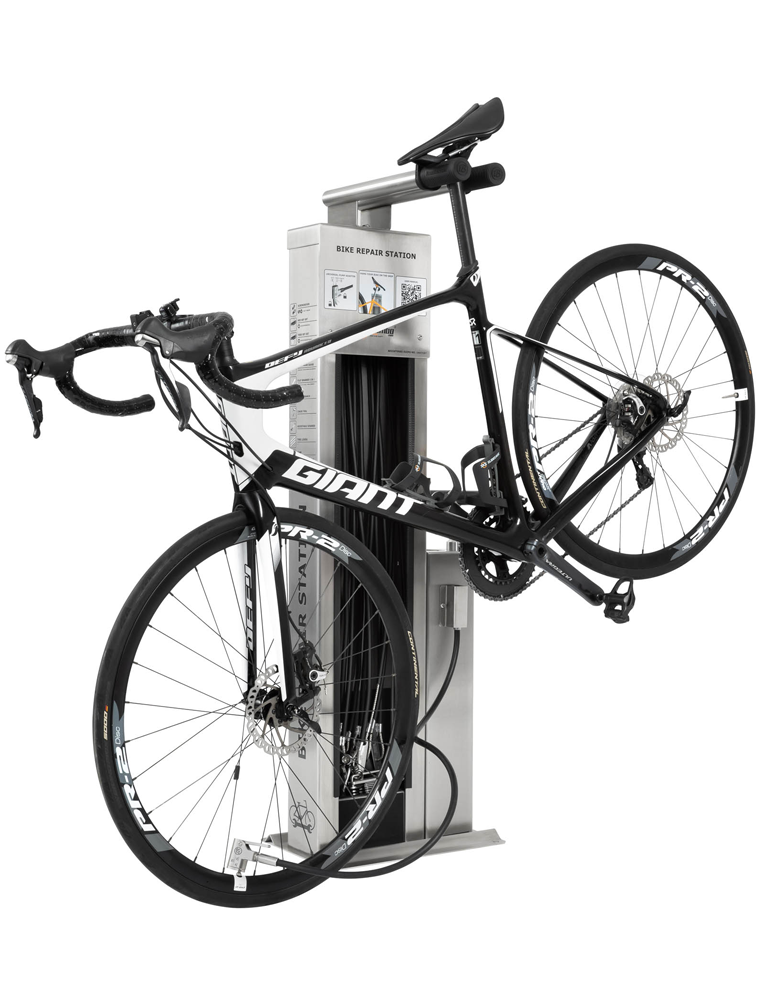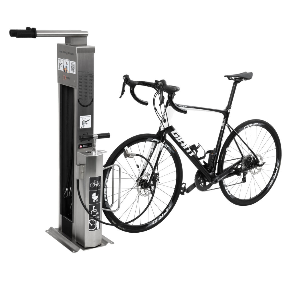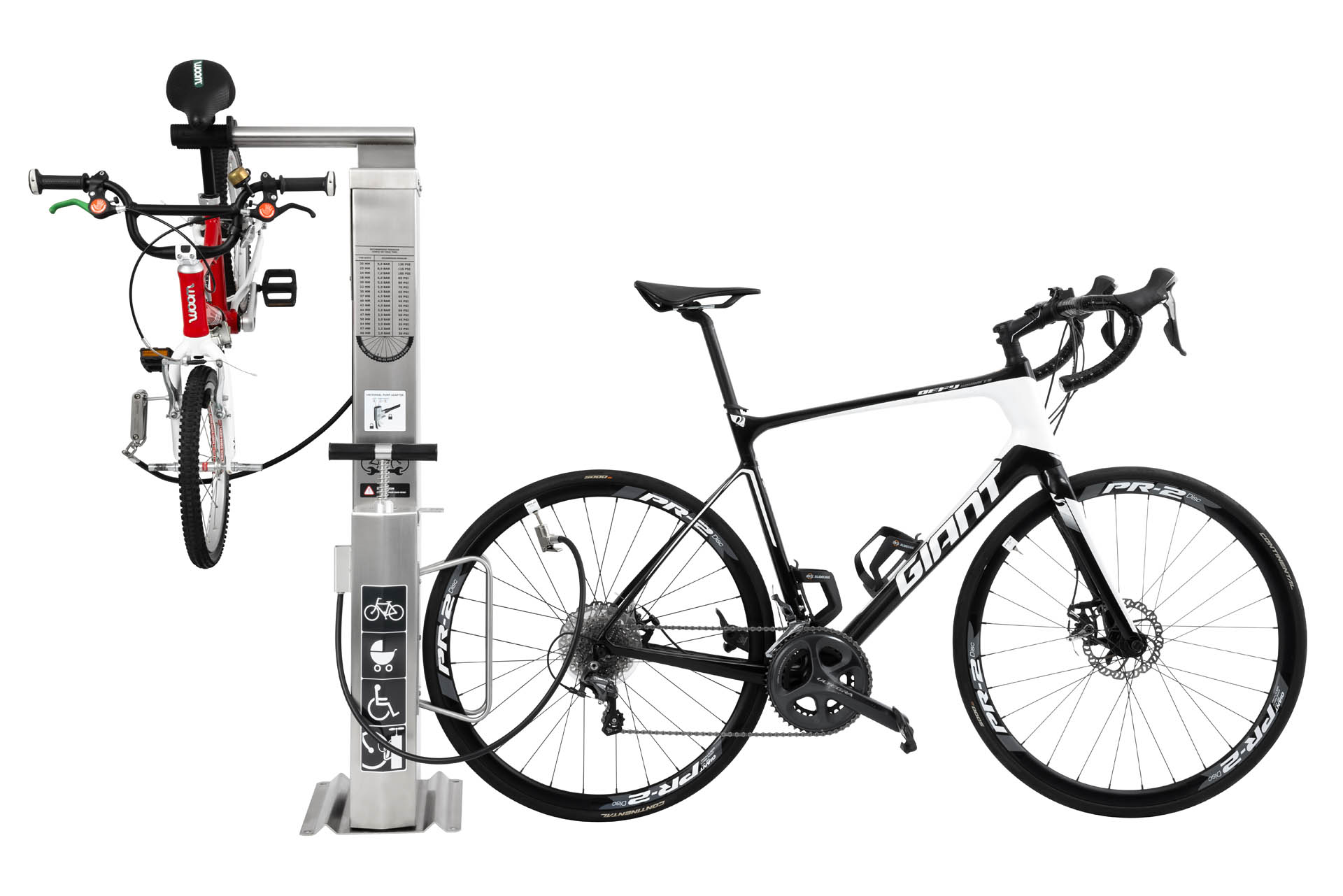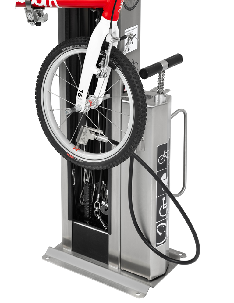 Gli attrezzi vengono fissati alle funi in acciaio inox appese all’interno della colonna della stazione; la lunghezza delle corde permette di raggiungere tutti i componenti della bicicletta. Il rivestimento in gomma delle corde impedisce agli attrezzi di aggrovigliarsi e protegge il telaio della bicicletta dai graffi. La stazione è dotata di una pompa manuale con un adattatore per tutti i tipi di valvole. La costruzione della stazione consente di posizionare la bicicletta sull’impugnatura, in modo da poter girare facilmente la pedivella durante la riparazione della bicicletta.