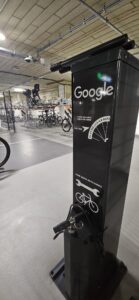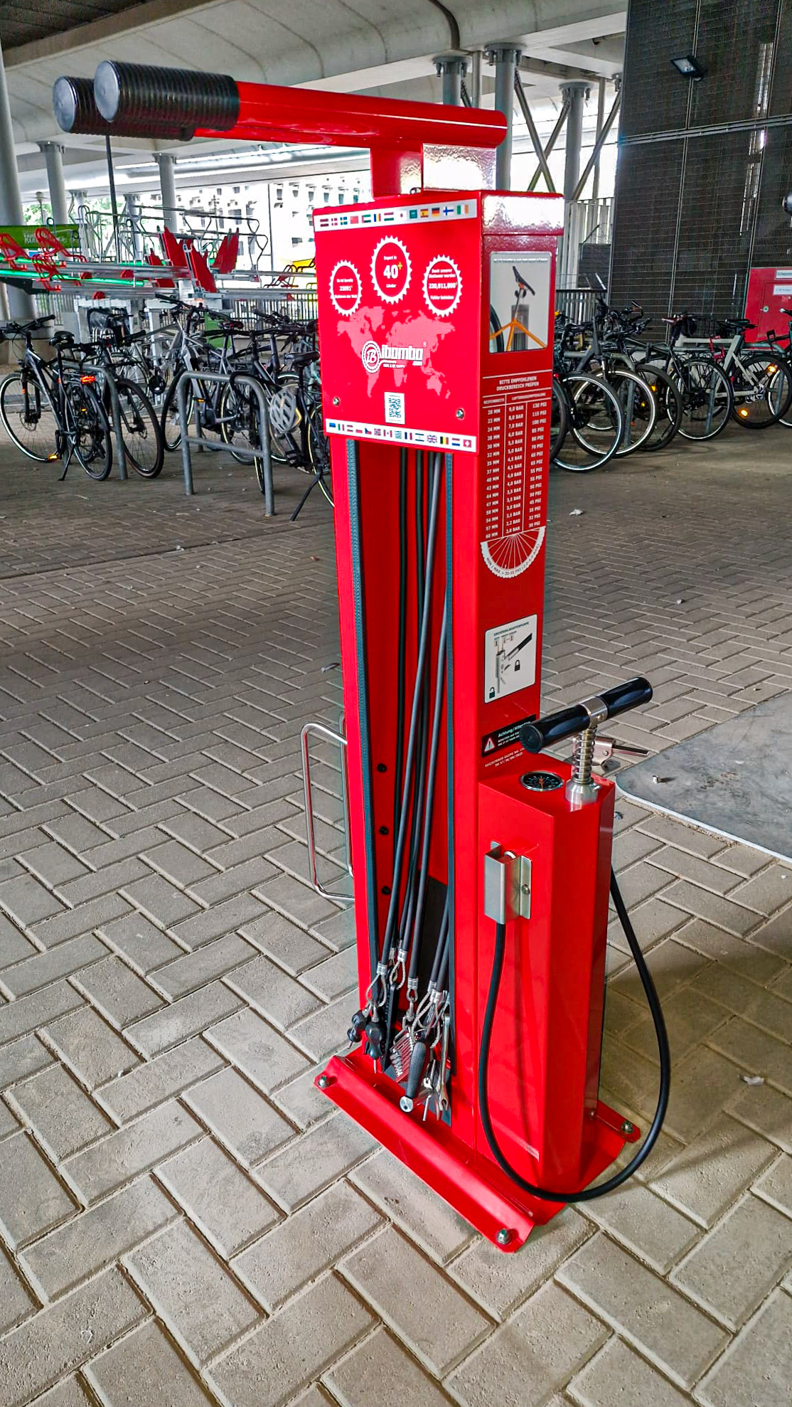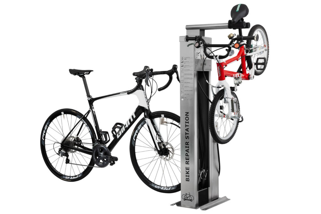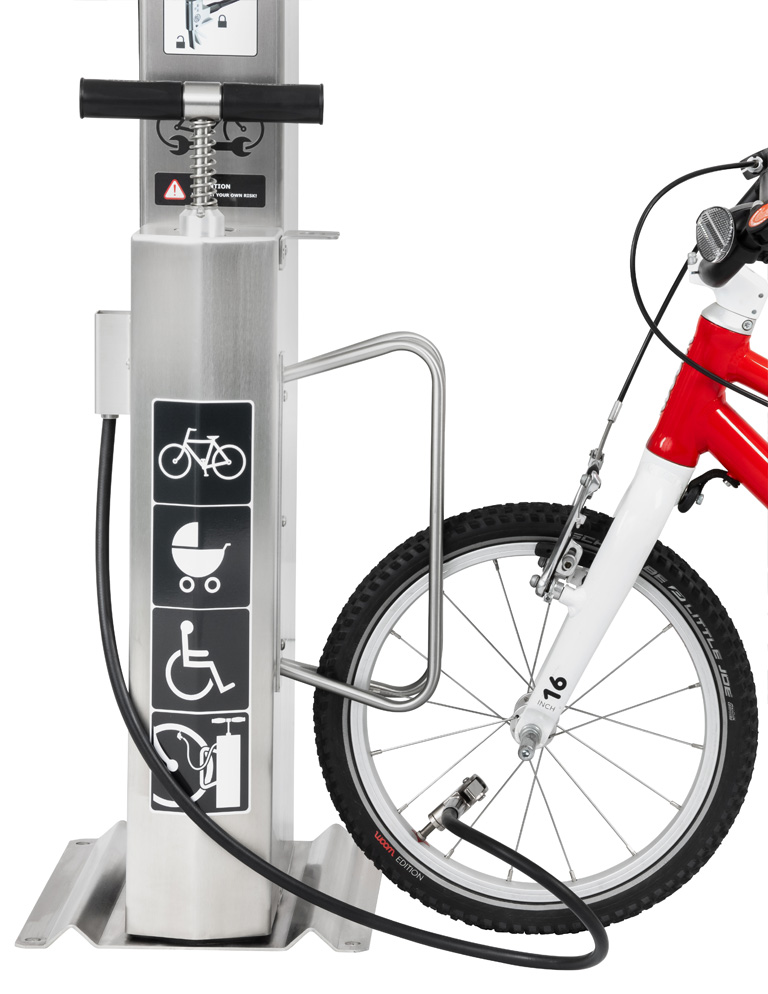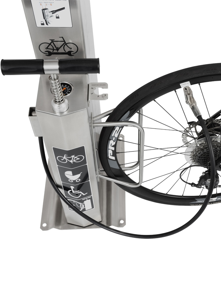 Gli attrezzi vengono fissati alle funi in acciaio inox appese all’interno della colonna della stazione; la lunghezza delle corde permette di raggiungere tutti i componenti della bicicletta. Il rivestimento in gomma delle corde impedisce agli attrezzi di aggrovigliarsi e protegge il telaio della bicicletta dai graffi. La stazione è dotata di una pompa manuale con un adattatore per tutti i tipi di valvole. La costruzione della stazione consente di posizionare la bicicletta sull’impugnatura, in modo da poter girare facilmente la pedivella durante la riparazione della bicicletta.